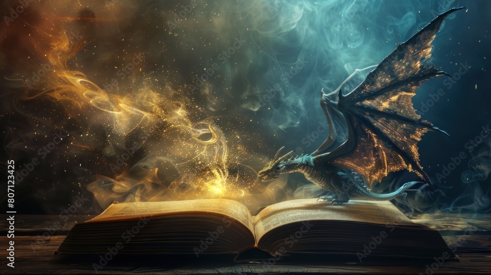 Plakat do Księgarni - Opened Magic book with magical dragon on page #807123425