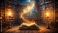 • Magic book in enchanting library with spirits & glowing light in the room, magic, book, enchanting, library, spirits