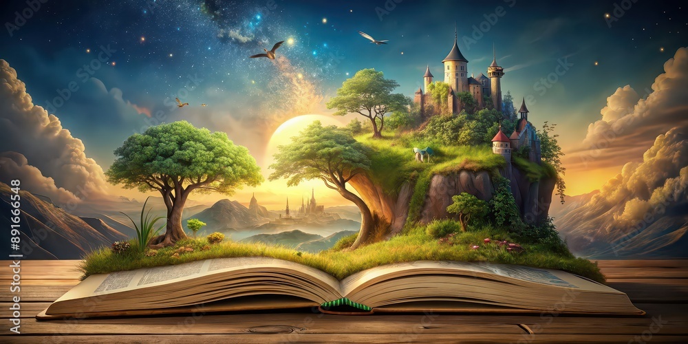 • Enchanted fantasy world inside an open book , imagination, creativity, education, reading, fantasy, magical