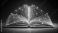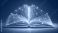 • A 3D wireframe model of an open book with glowing blue lines and nodes, suspended in mid-air, against a dark gradient background with subtle texture.
