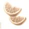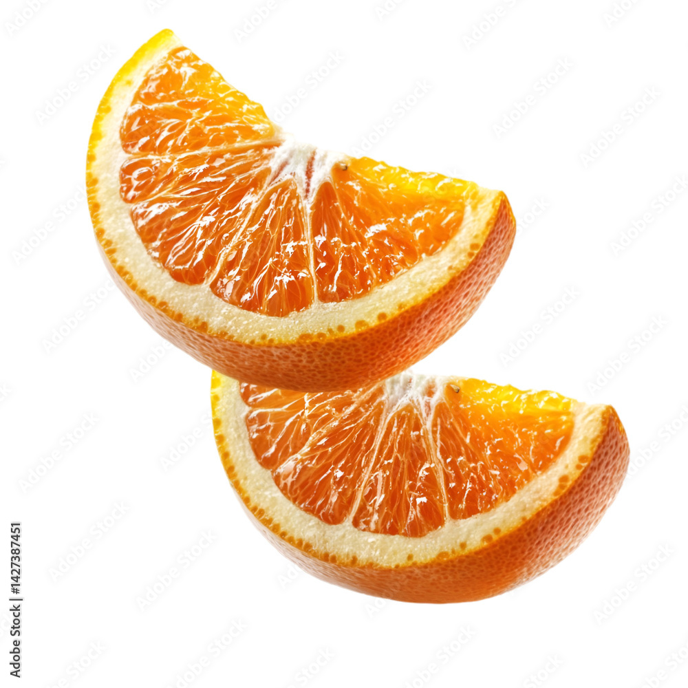 • Two juicy orange slices floating on black background refreshing citrus fruit