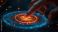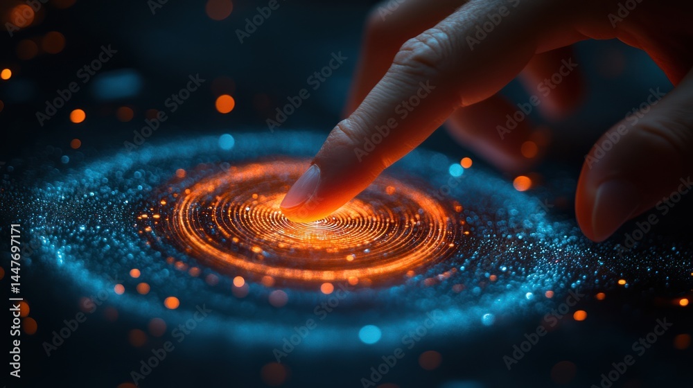 • Finger touching a glowing circular interface with blue and orange light effects.