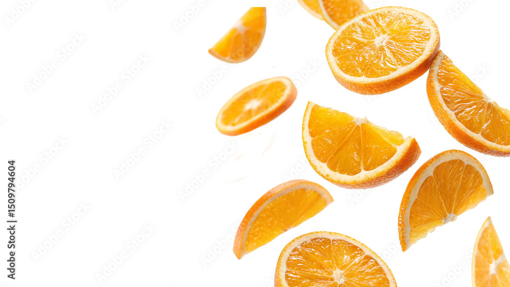 Plakat do Kuchni - Flying delicious orange slices cut out isolated on transparent background #1509794604