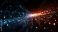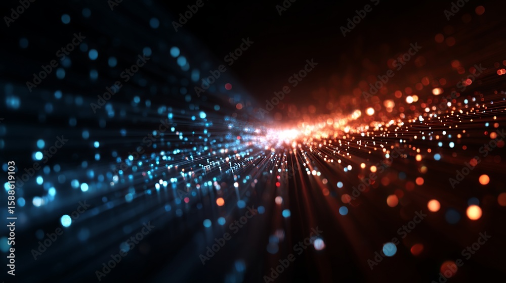 • Captivating convergence of blue and orange light particles emitting rays, set against a dark backdrop in an abstract design.