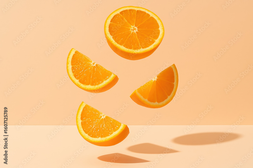 • Floating orange wedges and half slice with vibrant shadows on pastel background