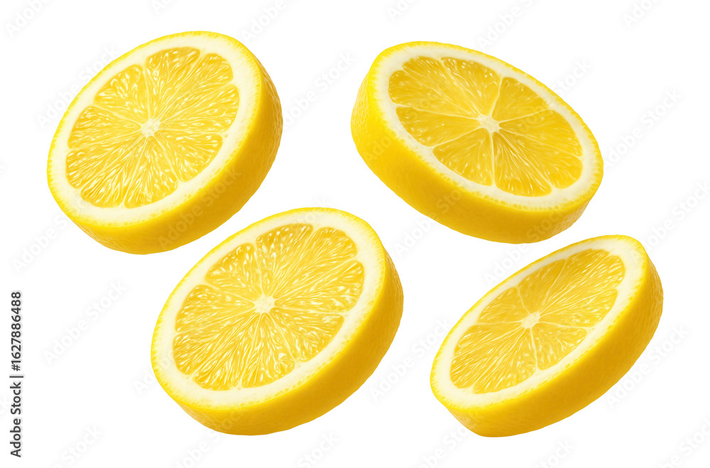 • Four slices of fresh lemon with visible juicy pulp and vibrant yellow rind on transparent background.