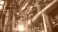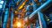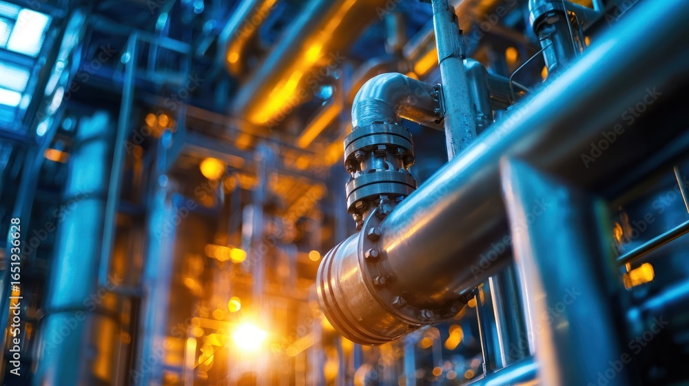 • Metal pipes and valves in a factory setting with a blue and orange glow.