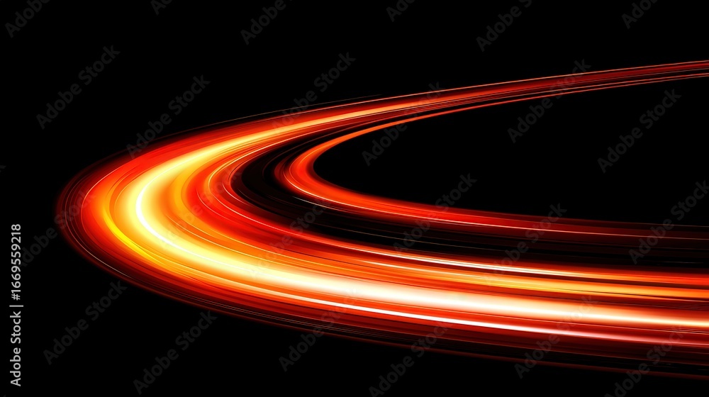 • A vibrant display of curved light trails in red and orange against a black backdrop, perfect for abstract art, technology themes, or creative digital designs, It conveys energy and movement,