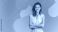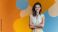 • Smiling young woman standing confidently with crossed arms in front of colorful geometric orange and blue background, modern business portrait with creative and professional vibe