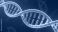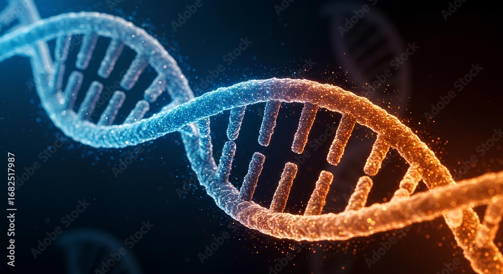 • Abstract scientific background with a futuristic DNA spiral in blue and orange tones on a dark background with free space for text