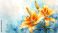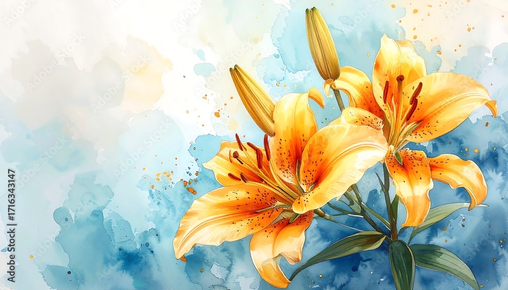 • Delicate orange lilies on a soft blue watercolor background