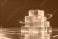 Stacked transparent orange cubes with glowing edges and orbital light trails on a reflective surface