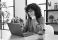 Plakat do Kuchni - A woman in an orange sweater smiles while using a laptop in a well-lit room with plants. #1739143146