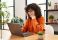 • A woman in an orange sweater smiles while using a laptop in a well-lit room with plants.