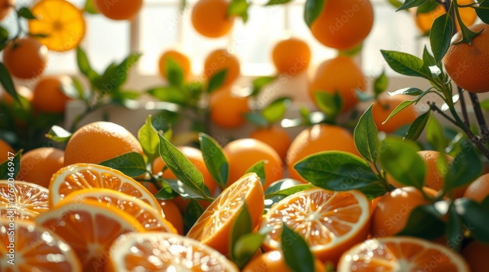 • Fresh oranges and orange slices surrounded by vibrant green leaves in a bright, sunlit environment for a healthy lifestyle