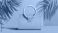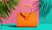 • Orange handbag on a colorful background with palm leaves.