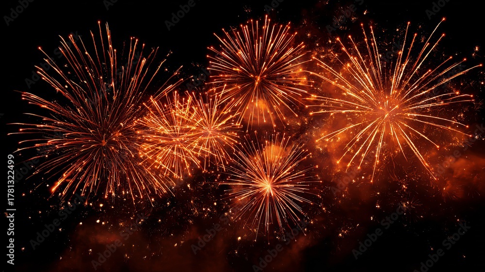 Plakat do Kuchni - Explosive bright orange fireworks burst across the dark night sky creating a dazzling celebratory... #1781322499