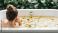 • Woman relaxing in a bath filled with lemon slices for a natural spa treatment