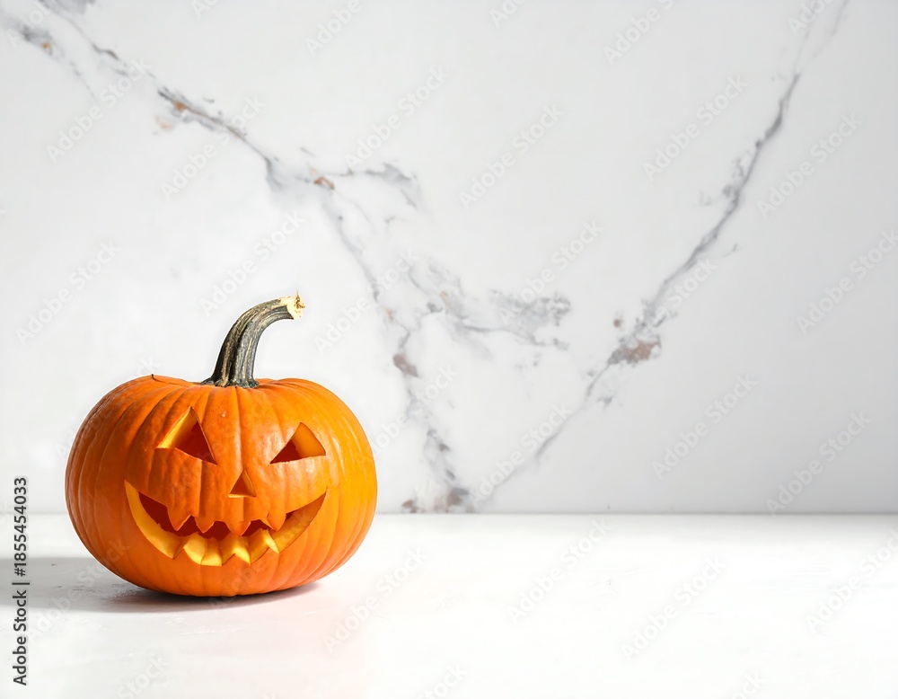 Plakat do Kuchni - A carved, grinning, orange seasonal squash with a stem rests on a white surface before a marbled... #1855454033