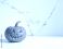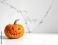 • A carved, grinning, orange seasonal squash with a stem rests on a white surface before a marbled backdrop