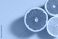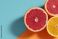 Plakat do Kuchni - two half of red grapefruit and orange paper with copy space against pastel blue background.... #1856266647