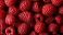 • Juicy berries spill, Vibrant red raspberries tumble from rustic wooden container with dew