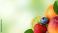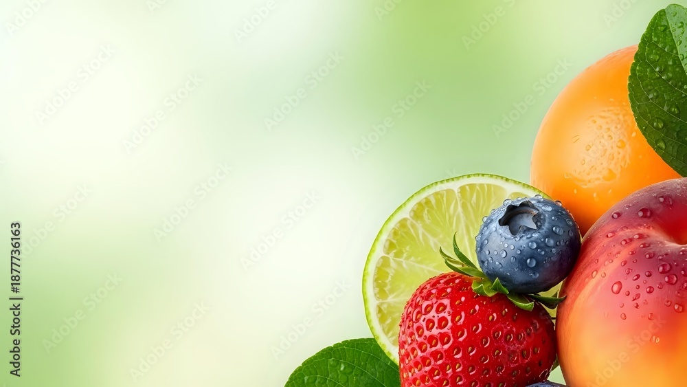 • Fresh mixed fruits with lime slice, strawberry, blueberry, orange and mango on green gradient background for healthy eating and nutrition concepts.
