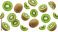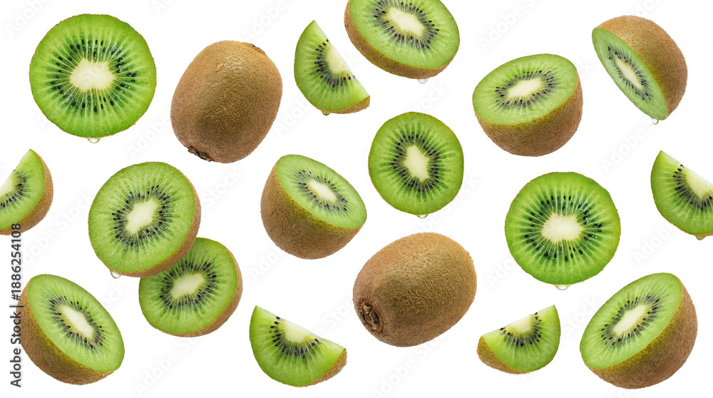 • a generous scatter of fresh kiwi fruit, comprising whole coconuts, halved sections, and precise slices against a black void.