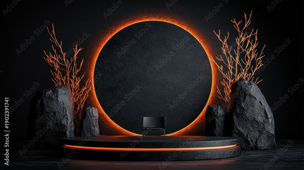 Plakat do Kuchni - A black platform with a chair and a large black circle in the background. #1902391741