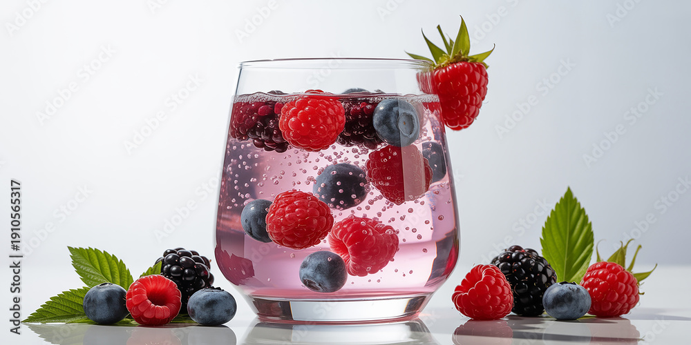 Plakat do Kuchni - Refreshing pink berry infused water with fresh raspberries and blueberries in a clear glass #1910565317