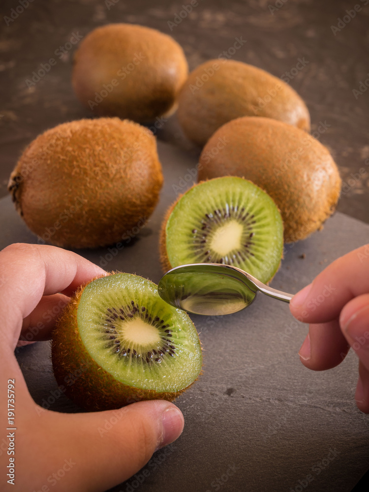 Plakat do Kuchni - eating kiwi with a tea spoon on stone background. #191735792