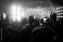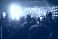 Music festival crowd with raised hands and smartphones under orange lights