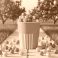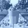 • Orange cup overflowing with popcorn in orchard setting