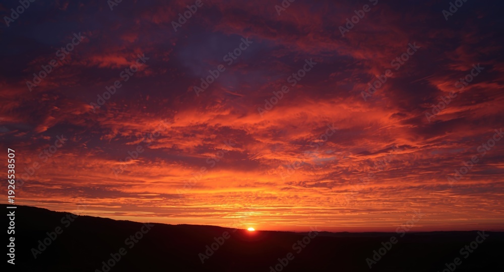 • Warm crimson and vibrant orange sky during sunset with dynamic clouds
