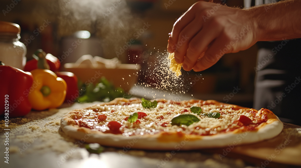 Plakat do Pizzerii - The chef sprinkles cheese on top of the pizza #1058202910