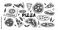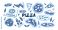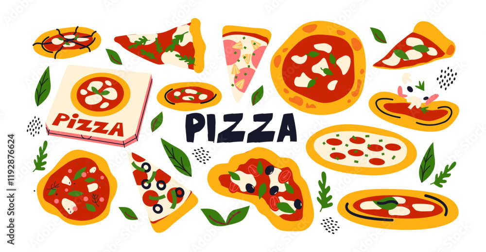 • Italian pizza with basil, tomatoes and mozzarella. Pieces of pizza, a set of ingredients, various toppings. Vegetables, cheese,salami, sauce. Cartoon doodle illustration for restaurant and cafe