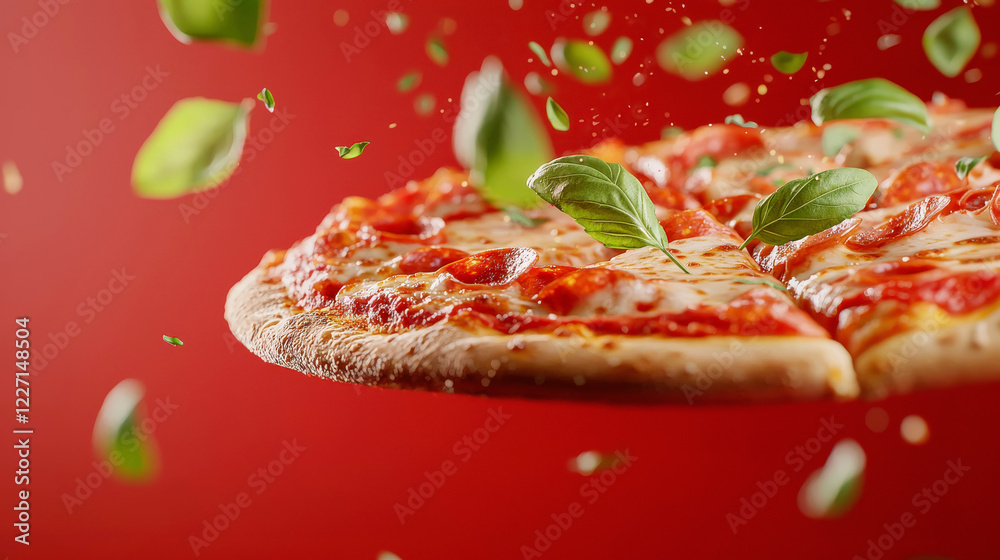 • golden baked pizza with melted cheese, pepperoni, and fresh basil leaves on vibrant red background