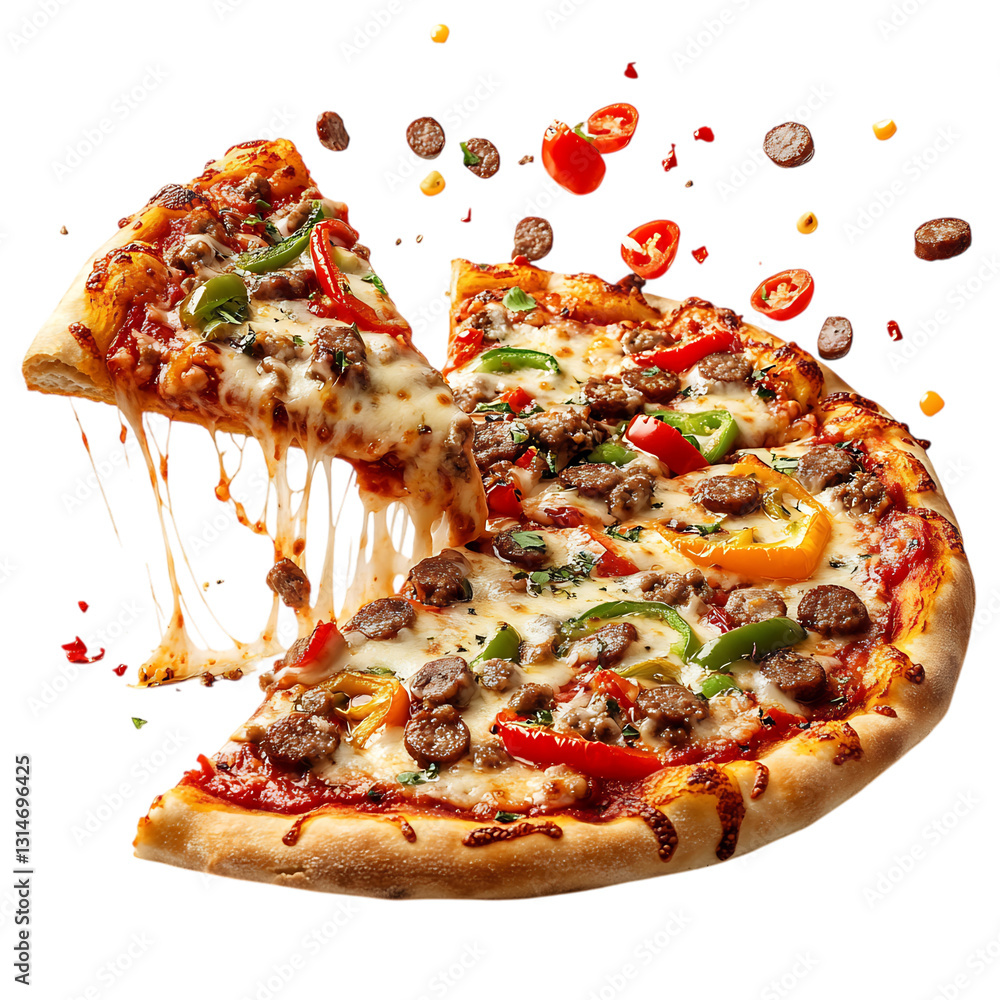 • A Flying Pizza Slice with Cheese Sausage and Peppers Isolated on Transparent Background