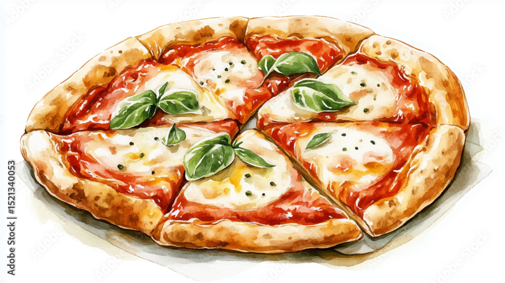 • Vector illustration, watercolor painting of Italian Pizza, isolated on a white background.