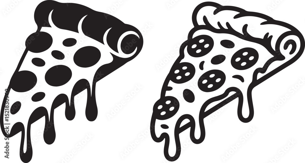 • Black and white pizza slice graphic set with silhouette and outline line art