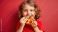 Plakat do Pizzerii - A little girl eats pizza on a red background. #1552886050