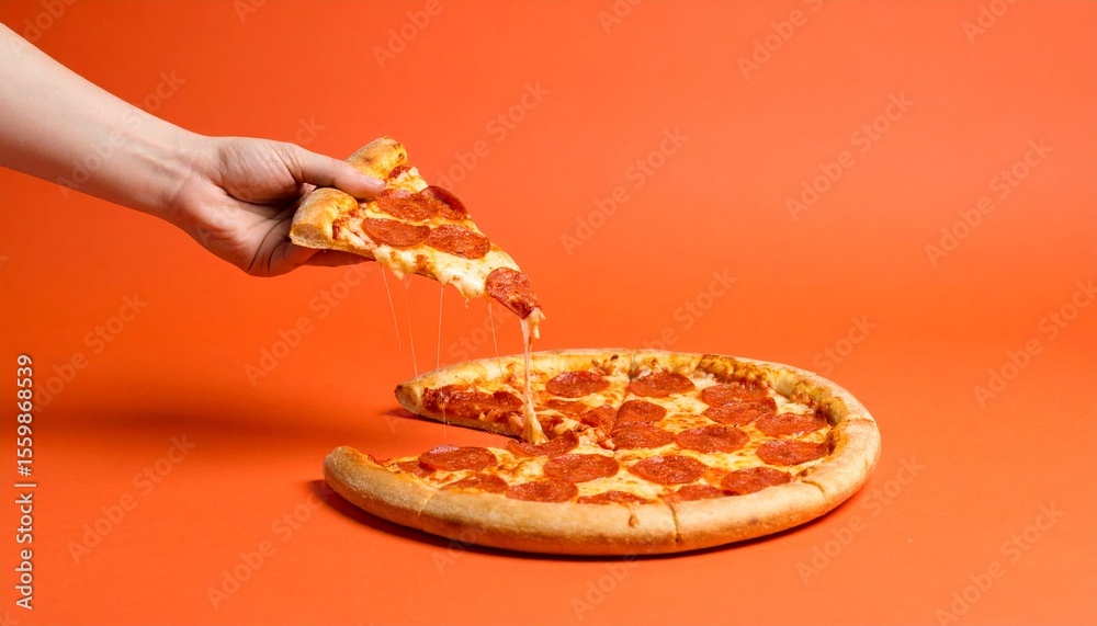 • side view of a full rounded pizza with peperoni and one slice coming up with cheese melting in between isolated on white background photo, clean solid orange background