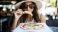 • Young woman enjoying pizza slice while sitting in outdoor cafe