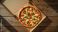 • Appetizing Margherita pizza with fresh basil and melted cheese, presented open in cardboard delivery box on rustic wooden table, ready to be enjoyed