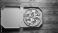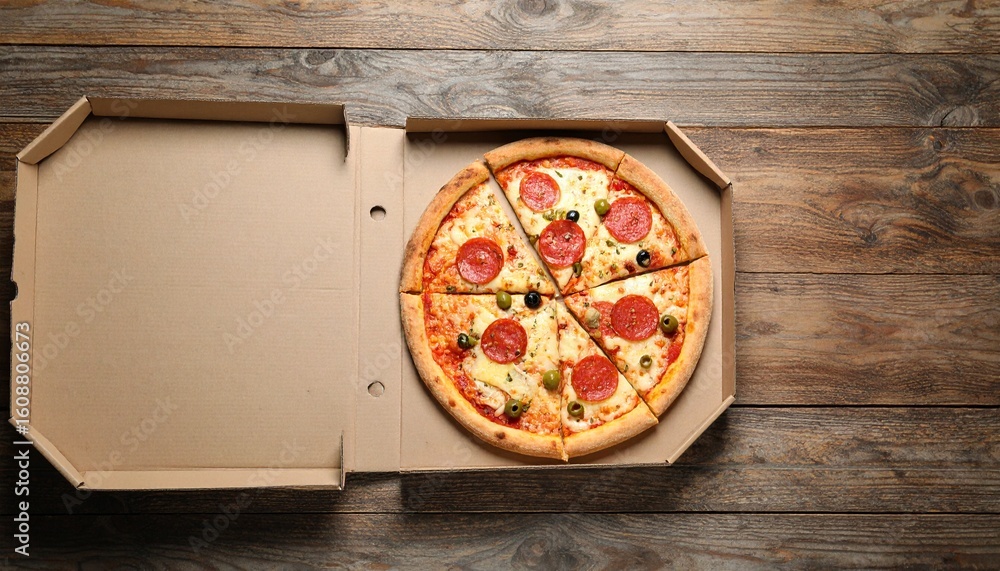 Plakat do Pizzerii - Top view of a hot pepperoni pizza with olives in an open takeaway box on a rustic wooden... #1608806673