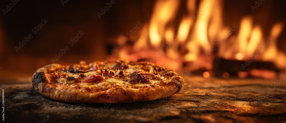 Plakat do Pizzerii - The delicious wood-fired pizza sizzling in front of a roaring fire. #1644089804