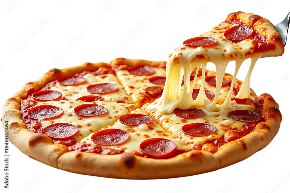 Plakat do Pizzerii - a delicious slice of pepperoni pizza with melted cheese being pulled, isolated on transparent... #1646032464