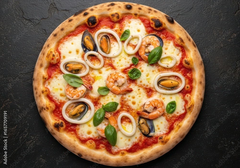 • Seafood Pizza Top View — Frutti di Mare with Shrimp, Mussels, Calamari and Mozzarella
