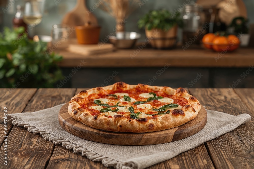 Plakat do Pizzerii - Preparing pizza on a rustic wooden surface with fabric and empty space for writing #1666746147