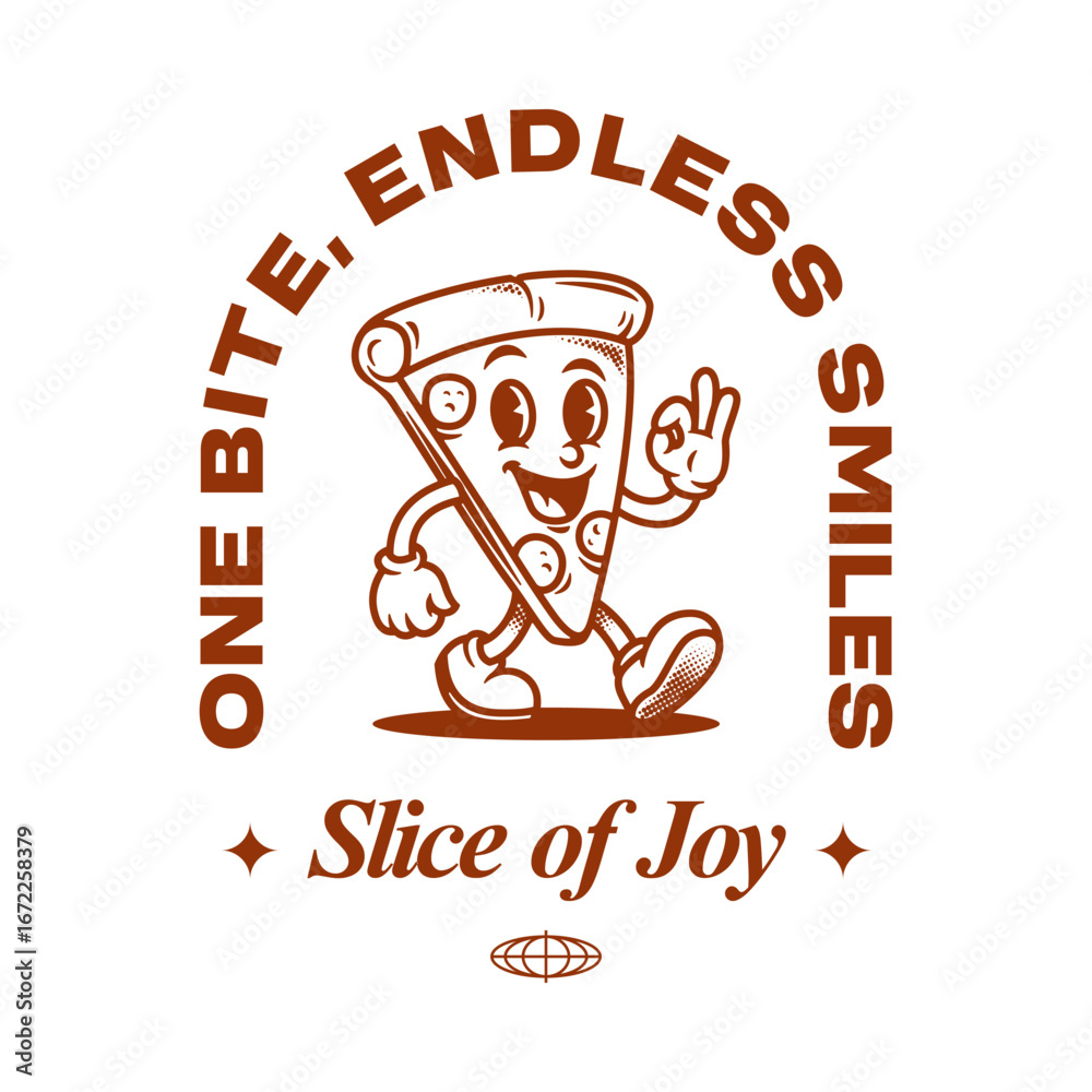• Funny pizza slice cartoon mascot with smiling face, retro vector illustration for food and restaurant design